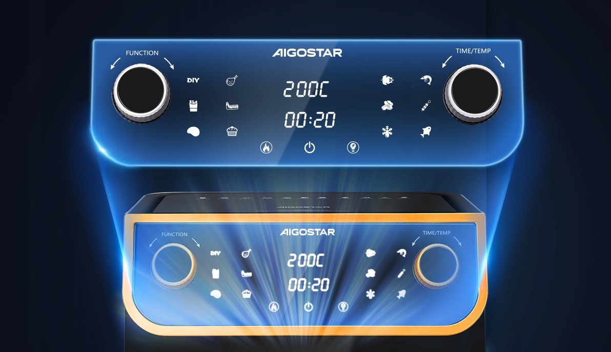 Innowacyjny projekt z dwoma pokrętłami i elektronicznym ekranem dotykowym, precyzyjna kontrola czasu i temperatury, prosta i przejrzysta obsługa.