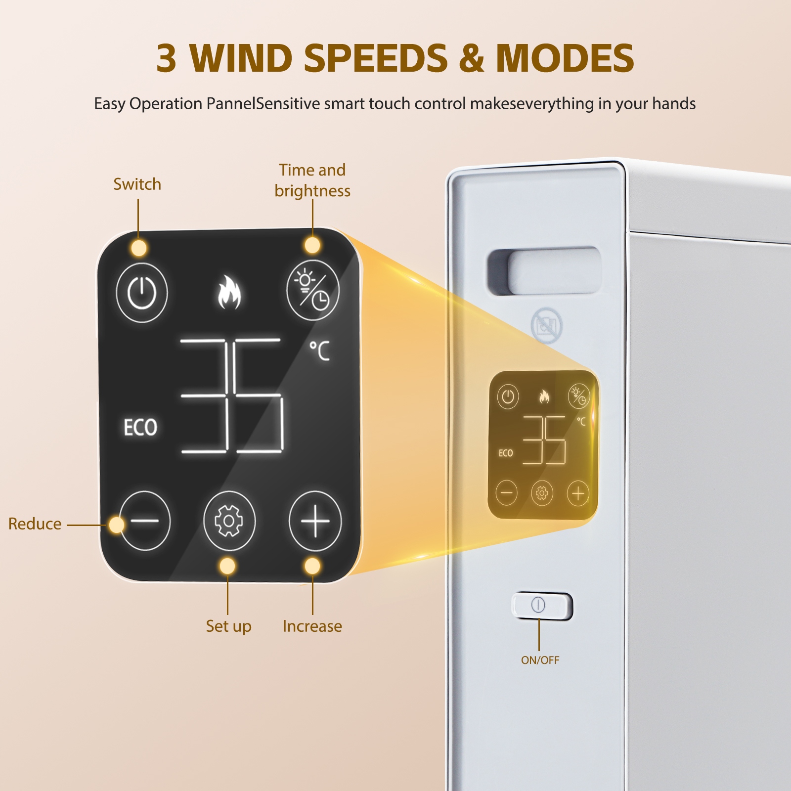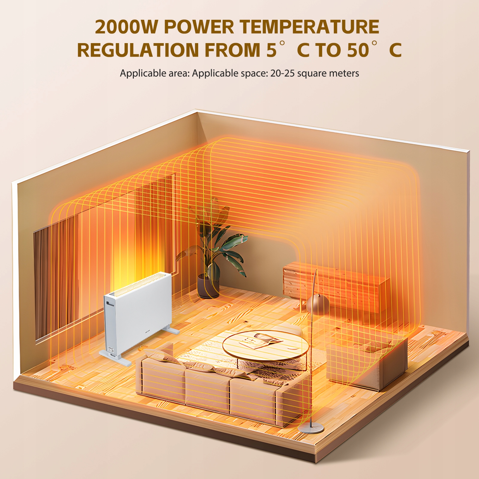Możesz wybrać temperaturę w zakresie od 5 do 50°C, termostat automatycznie wyłączy konwektor po osiągnięciu ustawionej temperatury i włączy go ponownie, gdy temperatura spadnie.