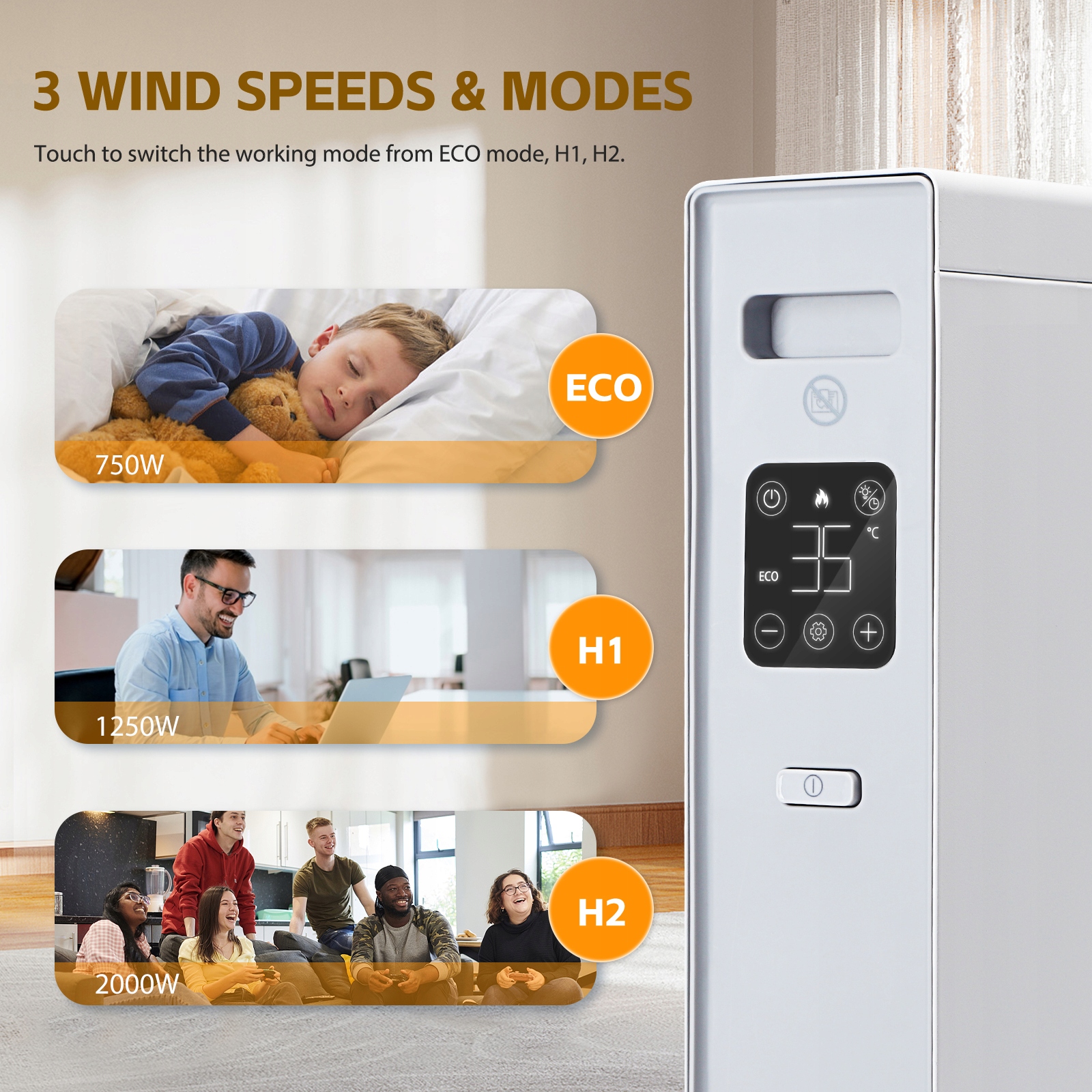 Ogrzewacz elektryczny o niskim zużyciu energii ma 3 poziomy mocy (EKO: 750W, H1: 1250W, H2: 2000W), doskonałe do ogrzewania pomieszczenia o powierzchni 20-25㎡.