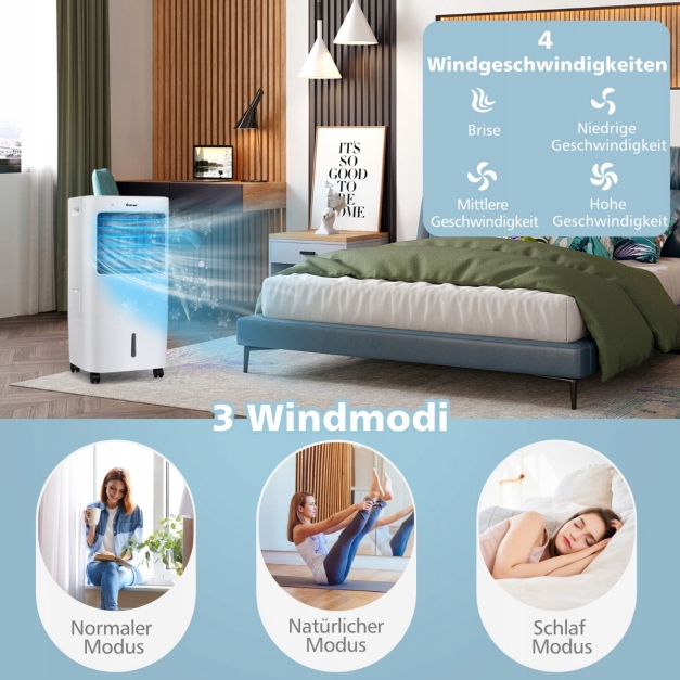 Zapewnij sobie przyjemny chłód w letnie dni i noce. Ten praktyczny wentylator ewaporacyjny działa jako chłodnica powietrza, nawilżacz i oczyszczacz, poprawiając komfort w pomieszczeniu bez konieczności instalacji rury odprowadzającej ciepło. Idealny do salonu, sypialni, biura czy pokoju dziecięcego.