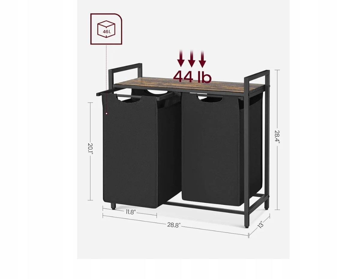 Kosz na pranie VASAGLE Kosz na pranie z 2 przegródkami, wysuwane i wyjmowane worki na pranie Półka z sortownikiem na bieliznę Metalowa rama Kosz do przechowywania 2 x 46 l 73 x 33 x 72 cm