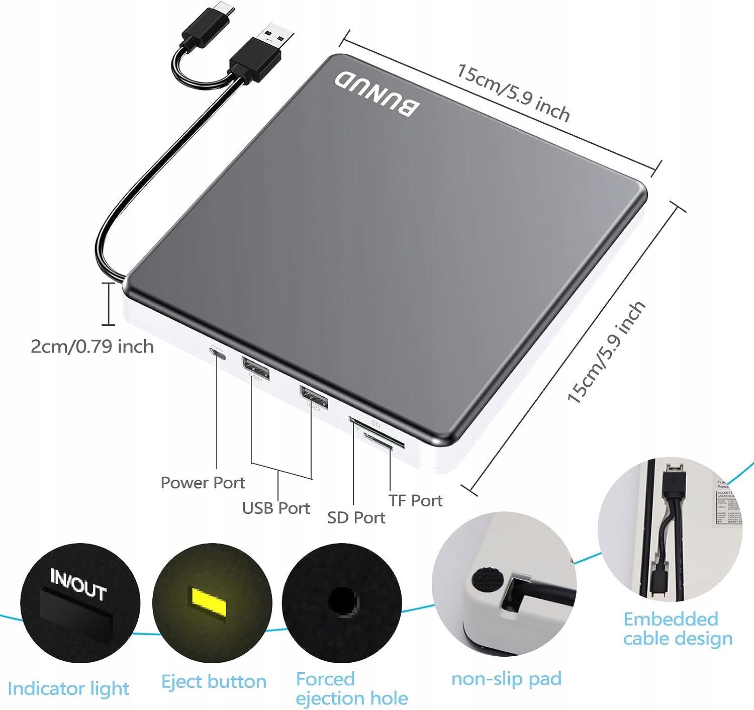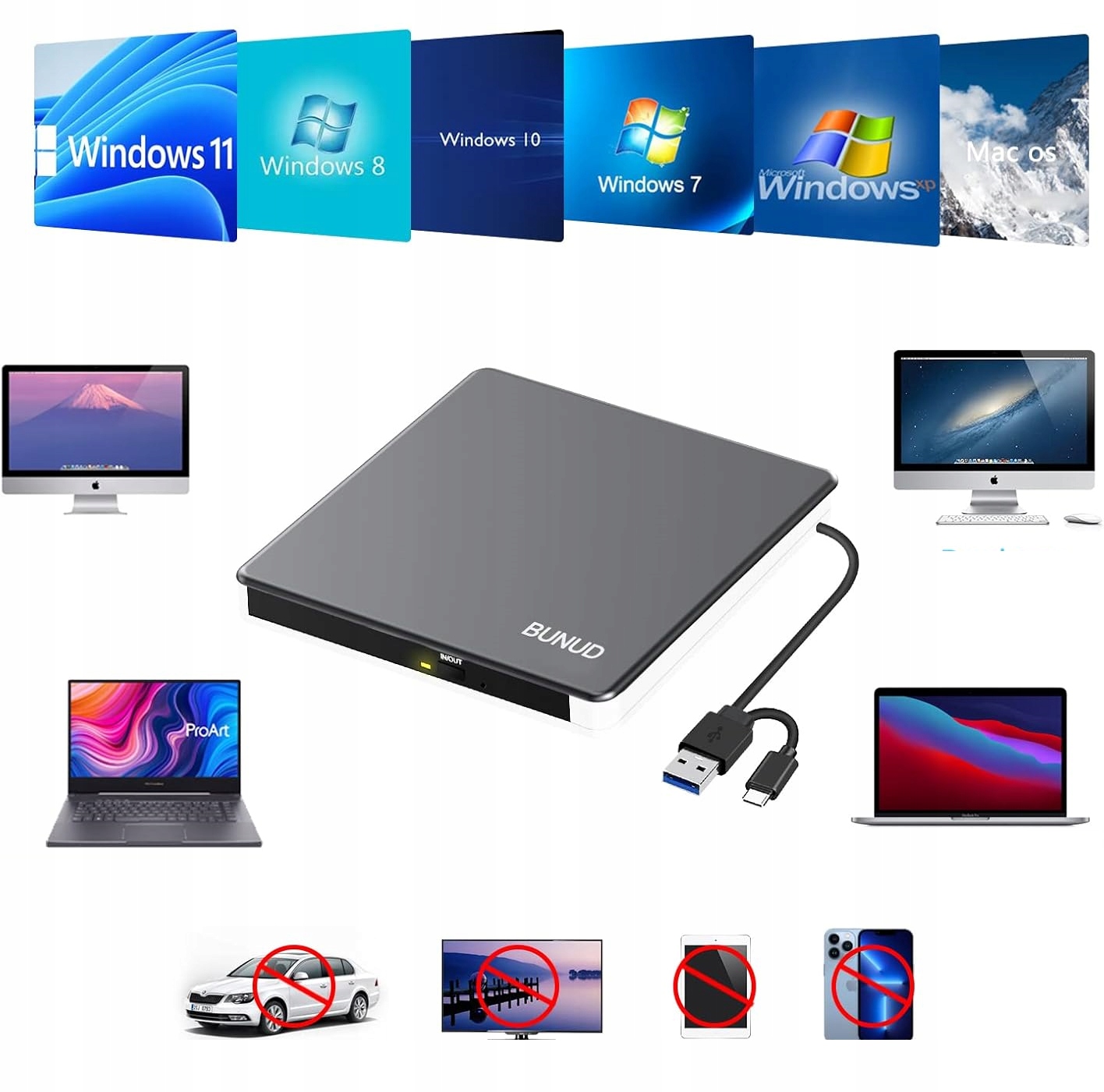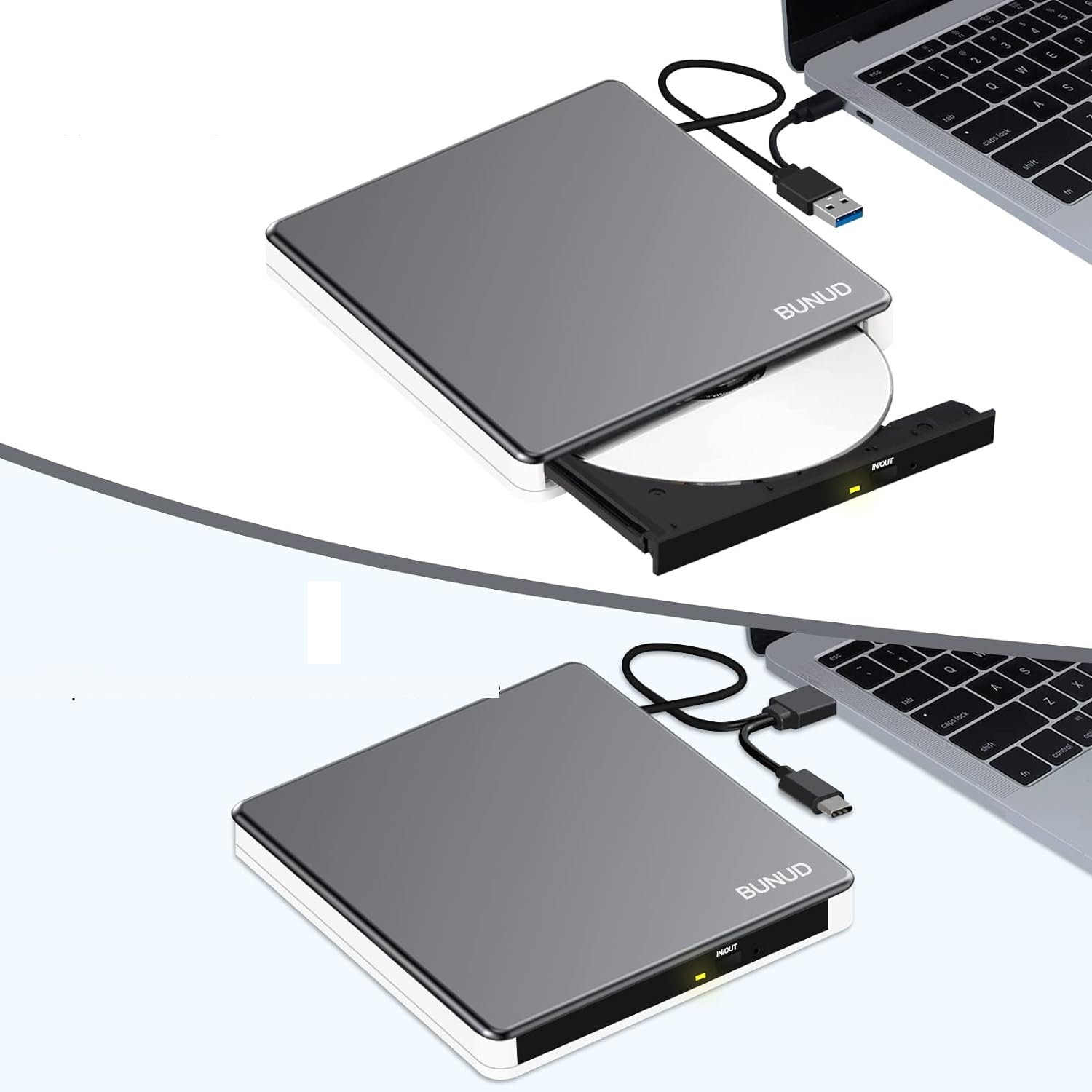 Elegancki i przenośny design: zewnętrzny odtwarzacz CD DVD / zewnętrzny odtwarzacz płyt CD DVD ze stopu aluminium ma smukłą, lekką i odporną na wstrząsy konstrukcję. Prosta konstrukcja sprawia, że zewnętrzny napęd optyczny jest bardziej elegancki i wykwintny. Kabel do transmisji danych jest ukryty wewnątrz odtwarzacza CD DVD do laptopa. Możesz umieścić ten zewnętrzny odtwarzacz CD DVD w torbie podróżnej lub na biurku.