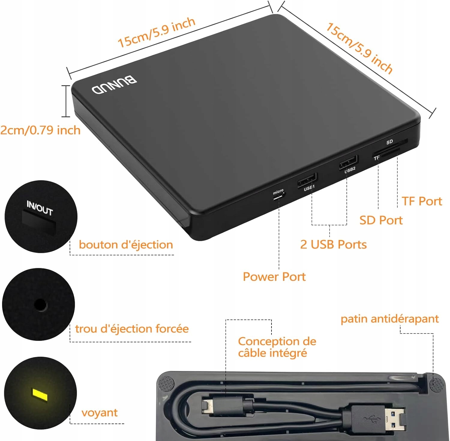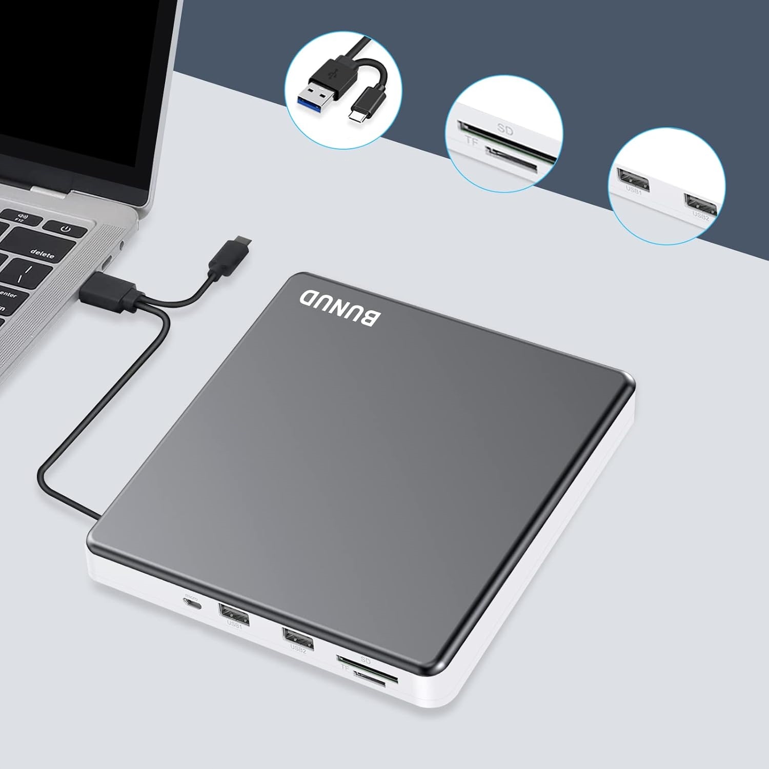 Zewnętrzny odtwarzacz CD 5 w 1: Zewnętrzny odtwarzacz DVD posiada niezależne gniazdo na karty SD/TF, 2 porty USB i porty micro USB. Może przesyłać zdjęcia i filmy bezpośrednio z karty SD/TF do komputera, dysku twardego USB i dysku flash.
