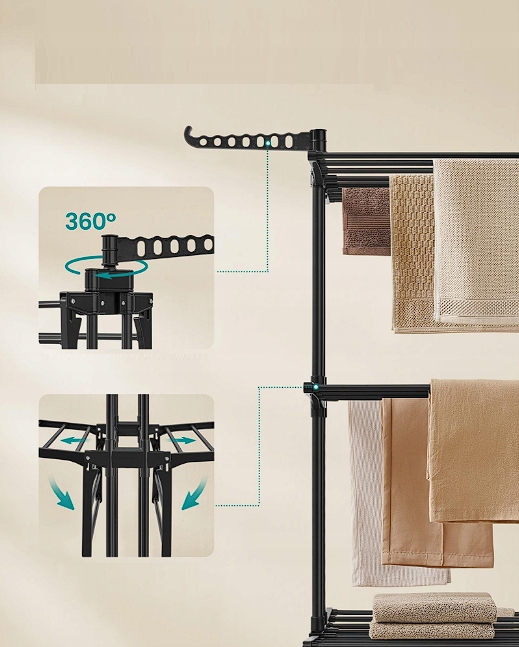 • Przestronny: Ta suszarka ma 4 poziomy i 2 obrotowe haki (łącznie 14 otworów) i oferuje wystarczająco dużo miejsca do suszenia ubrań, ręczników, kołder, butów i skarpetek. Maksymalna ładowność statyczna: 35 kg