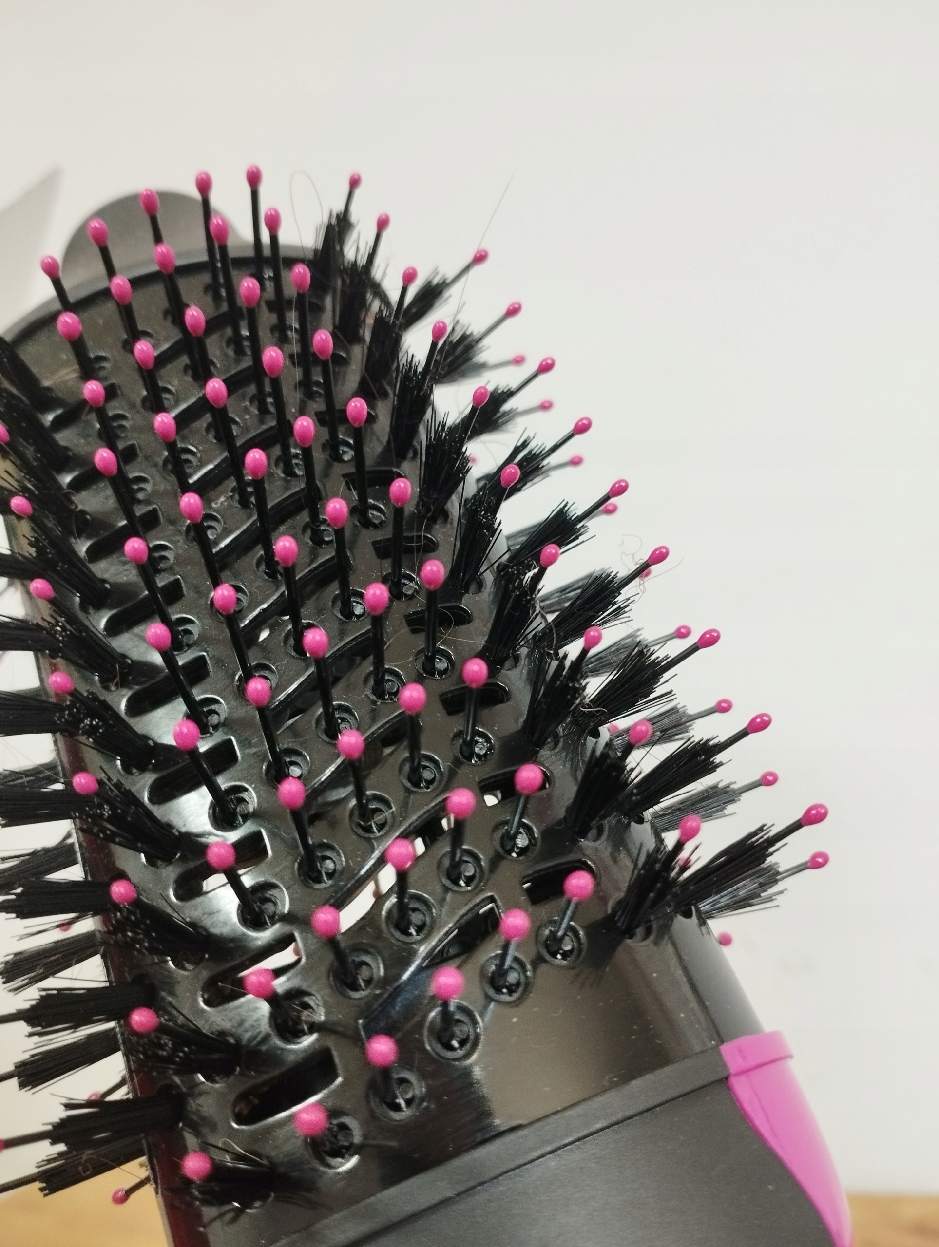 Nylonowe włosie z wygodnymi kuleczkami delikatnie rozczesuje włosy. Włosie z dzika ułatwia chwytanie włosów przez szczotkę.