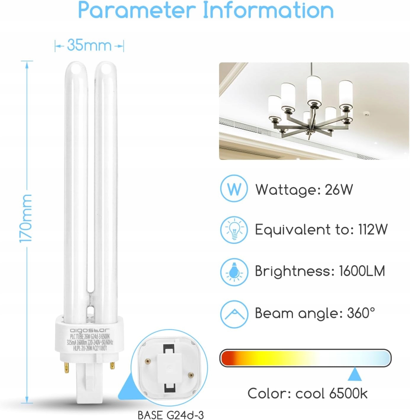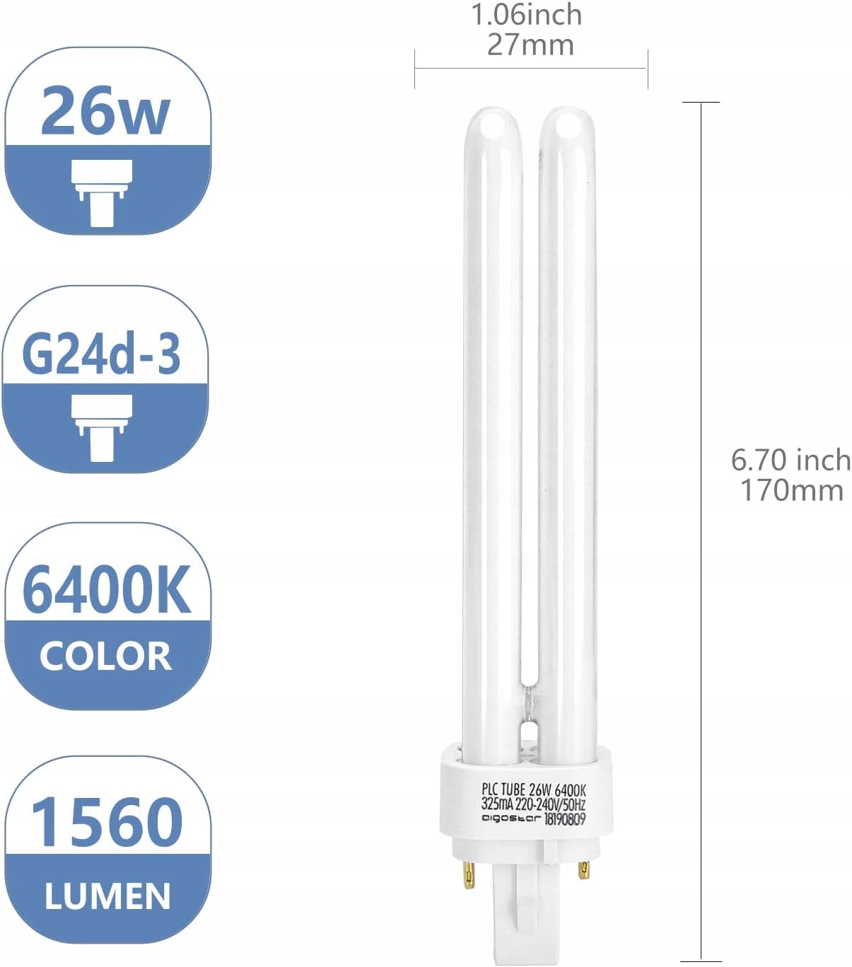 - Świetlówka LED Aigostar G24d-3 to wysokiej jakości żarówka LED, która emituje białe, zimne światło o mocy 1600 lm. Dzięki swojej mocy znamionowej wynoszącej 26 W, jest to bardzo wydajne źródło światła. Żarówka ta pasuje do gwintu G24 i zużywa 26 kWh energii na 1000 godzin pracy.
