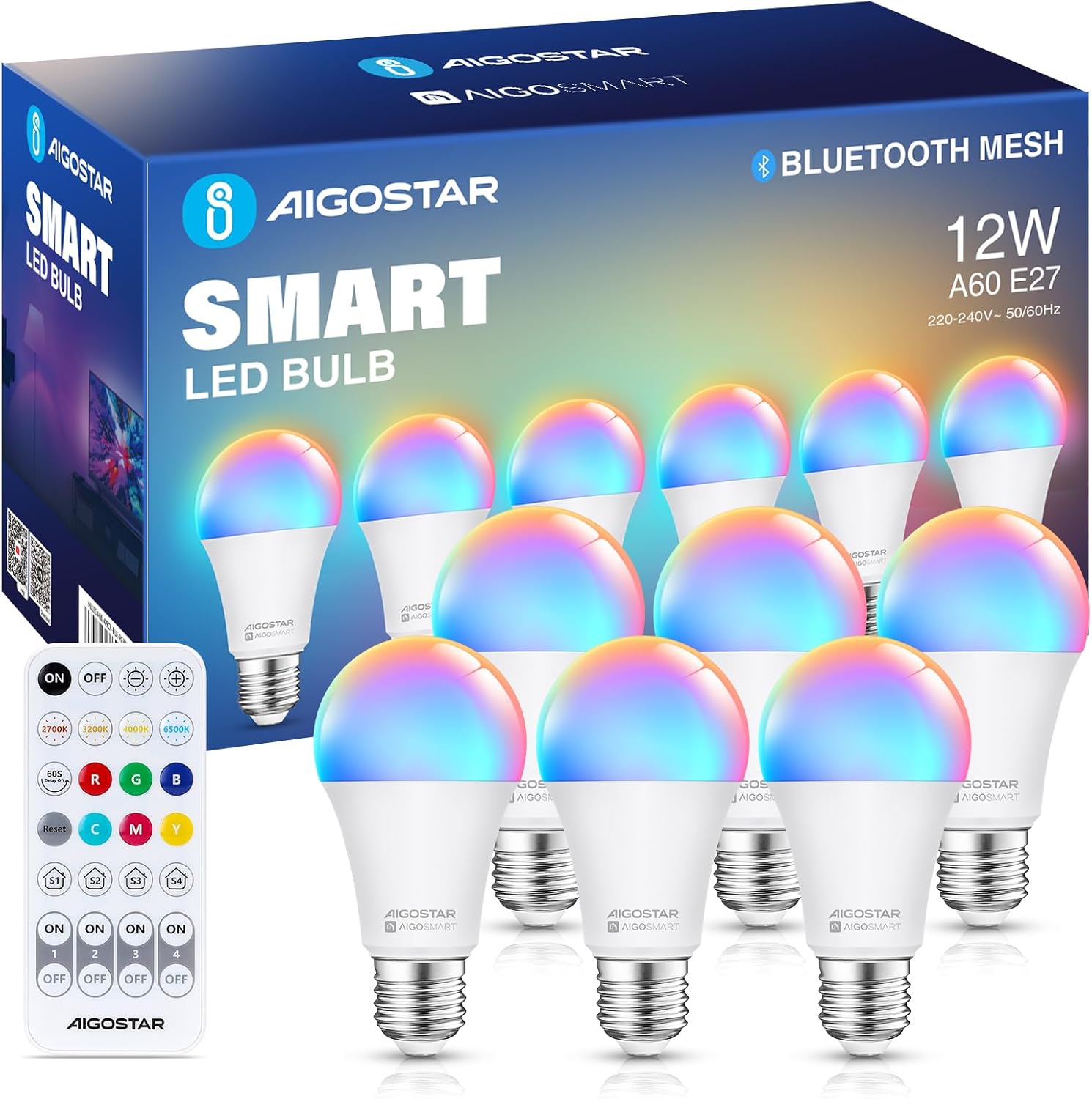 Aigostar Mesh – żarówka Alexa 12 W z Bluetooth Mesh A60, inteligentna żarówka współpracuje z Alexa, Smart Bulb E27 LED 1150 lm RGB i 2700-6500 K, 6 sztuk (z pilotem zdalnego sterowania Bluetooth)