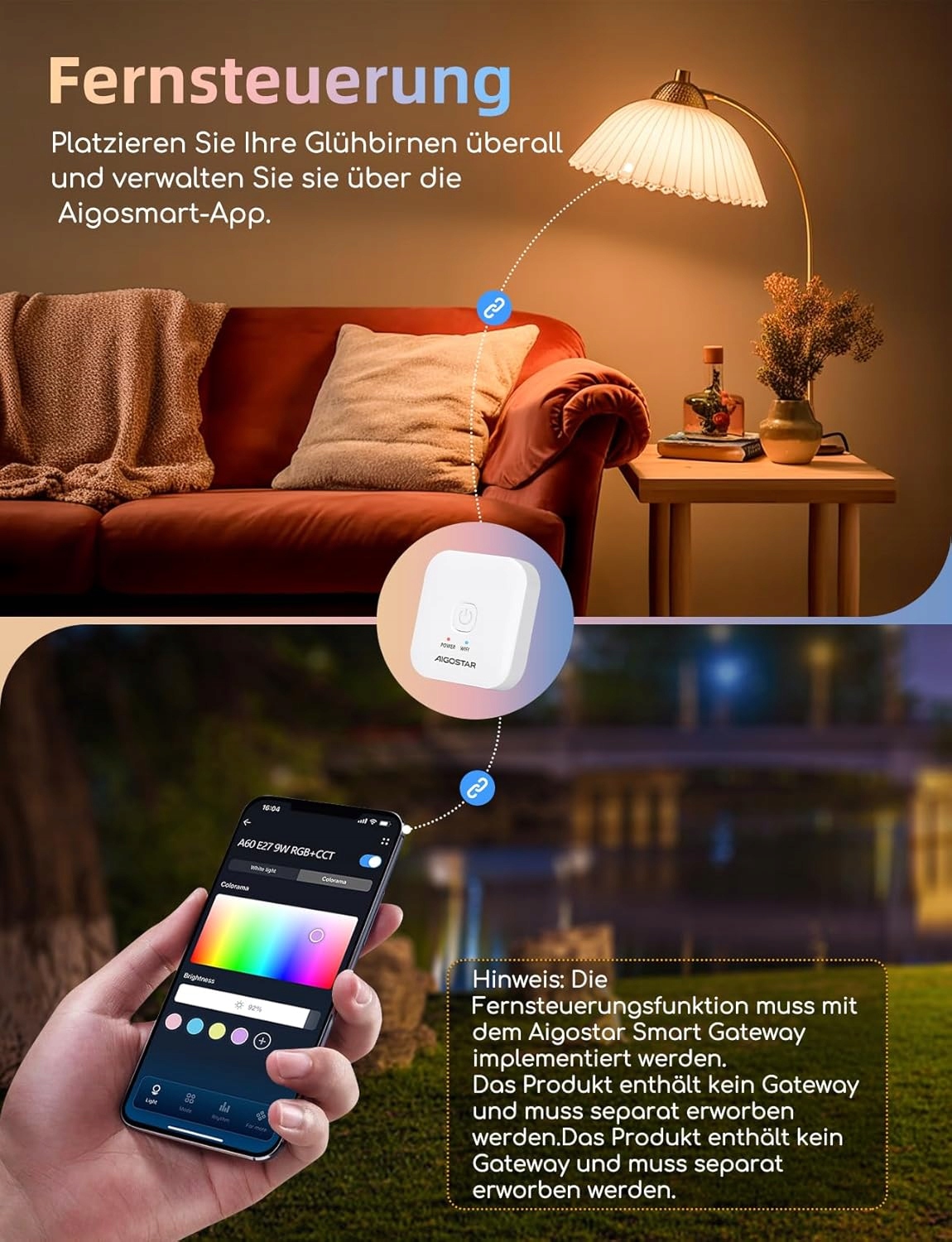 • Zalety bramki: dzięki bramce Aigostar Smart Gateway można korzystać z większej liczby metod kontroli! Poprzez połączenie aplikacji Aigosmart z inteligentną żarówką można ją zsynchronizować z aplikacją Alexa. Jeśli nie masz Aigostar Smart Gateway, nie możesz go zsynchronizować z aplikacją Alexa, ale nadal możesz skorzystać z metody bezpośredniego połączenia Alexa Echo do szybkiego sterowania swoim inteligentnym domem