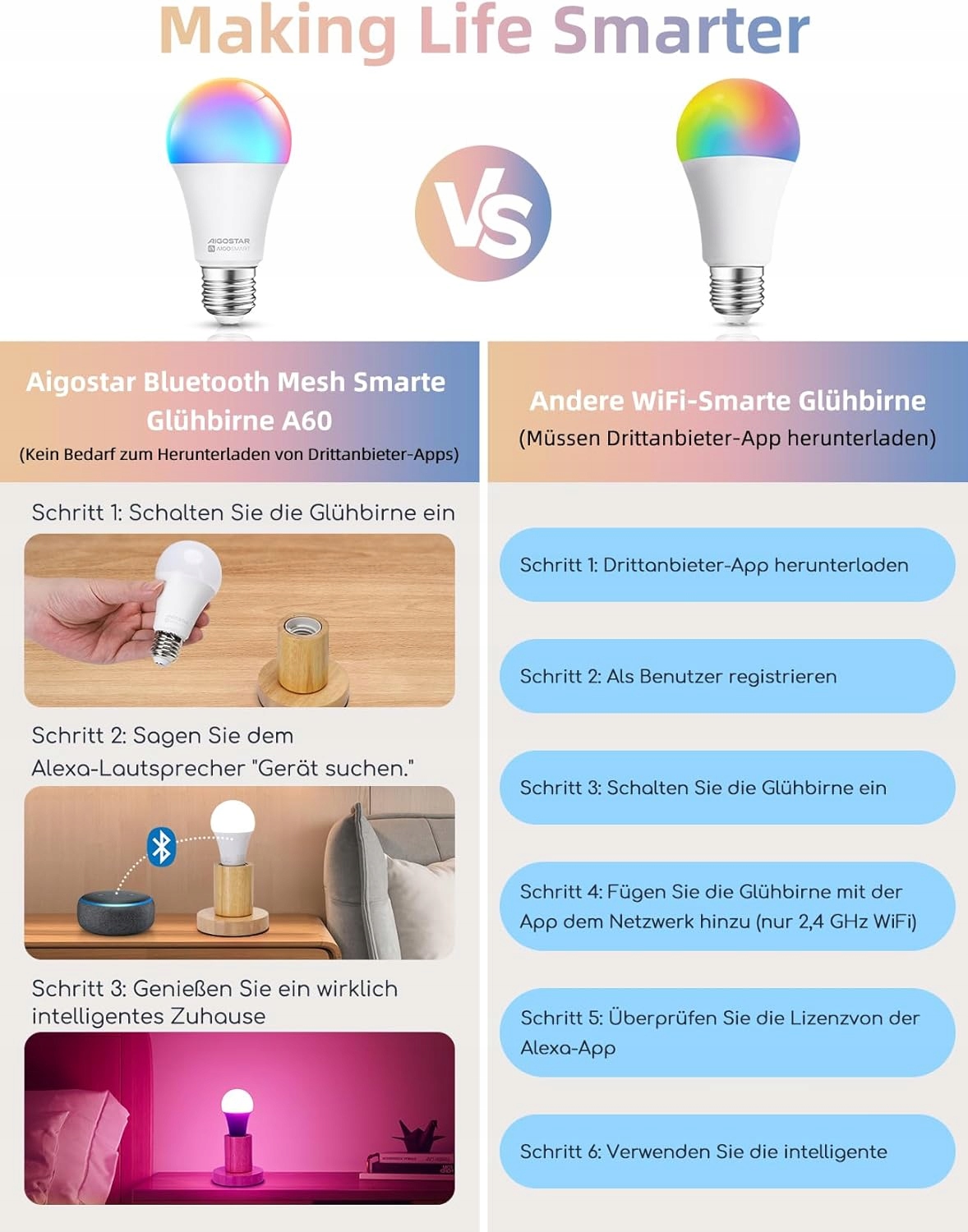 • Wielofunkcyjne doświadczenie: inteligentną żarówkę można połączyć bezpośrednio z bramką za pomocą aplikacji Alexa za pomocą sterowania głosowego lub aplikacji Aigosmart, a obie metody umożliwiają łatwe zdalne sterowanie. Dzięki sterowaniu czasowym inteligentna lampa LED może podążać za Twoim harmonogramem. Jednocześnie inteligentne żarówki tego samego modelu można grupować w domu, aby umożliwić łatwe centralne zarządzanie i cieszyć się inteligentnym życiem